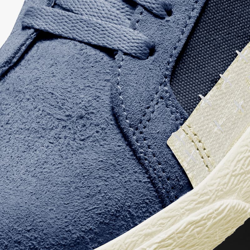 Nike Blazer '77 Vintage. Those embroidered flourishes appear on the sneaker’s heel tab, Swoosh and forefoot overlay, with each component rendered in navy textile with contrast white stitching. Nike SB Zoom Blazer Mid.