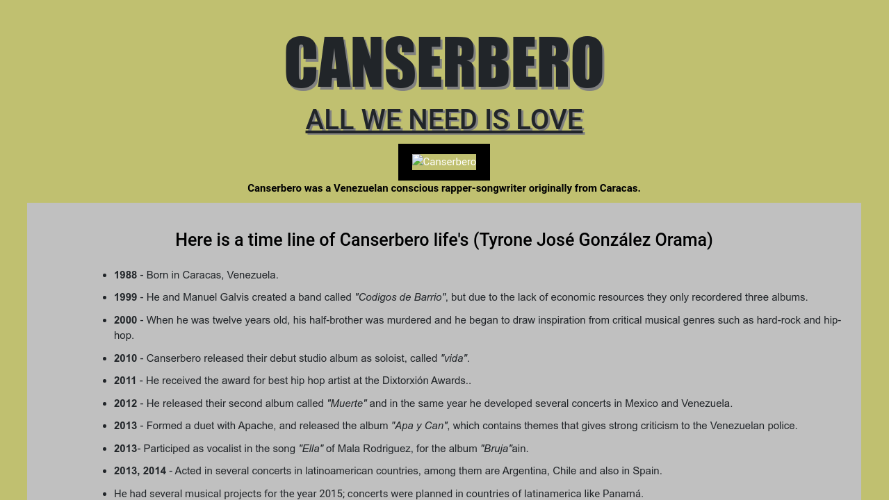 Canserbero, cuyo verdadero nombre es Tyrone González Oramas, nació en el hospital Lídice de Caracas, Venezuela, hijo de José Rafael González Ollarves y Leticia Orama. Tatuaje ALL WE NEED IS LOVE en homenaje a Canserbero - Duration:. 25.479 Me gusta · 160 personas están hablando de esto.