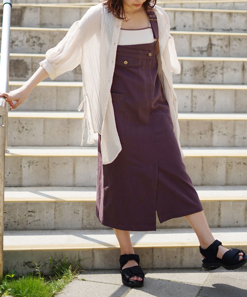 送料無料 メール便不可 サロペットスカート レディース ジャンパースカート 無地 綿100 コットン チノ ロング丈 ss Coca 16 04 泉見祐希さん オーバーオール ワンピース オールインワン フロントスリット サイドボタン 台形