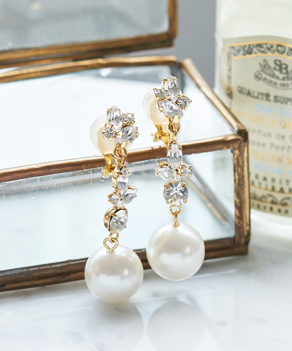 大きめパールのフラワー ビジュー イヤリング アクセサリー アクセ パーティー パーティ フォーマルピアスみたいなイヤリング 痛くないドレス 結婚式 お呼ばれ アクセサリー パールイヤリング パール セット レディース ジュエリー 品番 Becw Clarissa