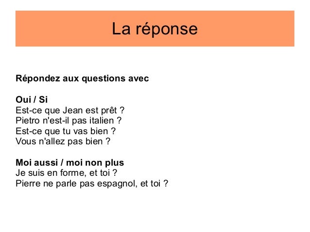 Moi aussi moi non plus moi si. Réponse à une phrase négative. J'ai accepté son invitation ;. Vous n’êtes pas du même avis, vous dites… 4.