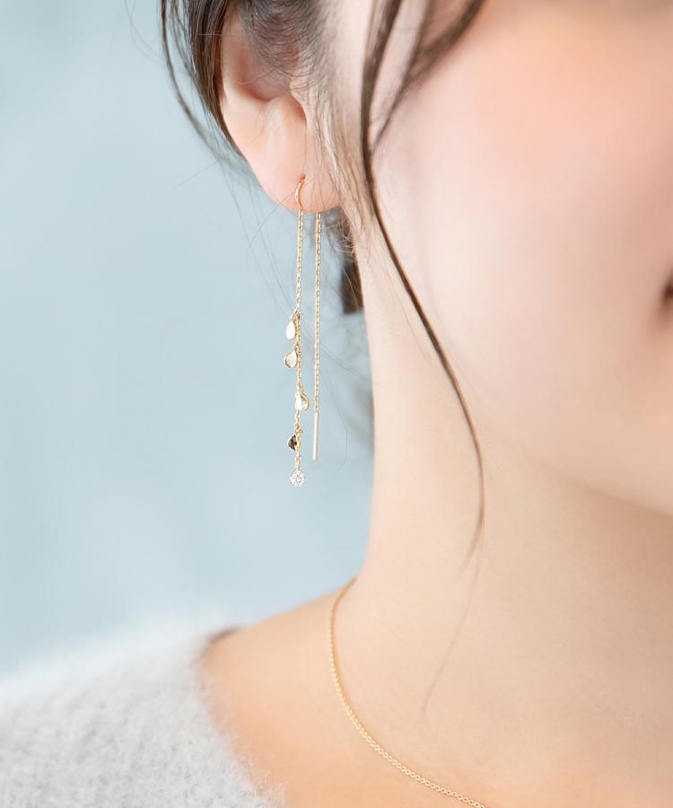 星の形に留めたダイヤモンドが揺れる 繊細なデザインのアメリカンピアス 揺れ感がフェミニンで さりげない女性らしさを演出 その日のコーディネートやヘアスタイルに合わせて 前後のチェーンの長さを変えられるのもポイント シンプルなデザインなので毎日使える