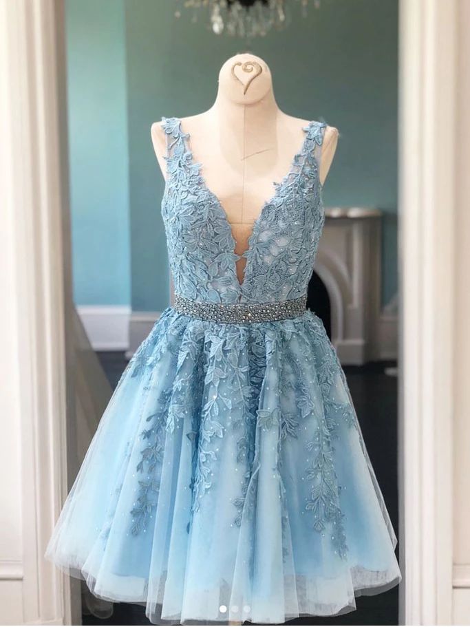 V Neck Blue Prom Dresses Short Appliques Lace Homecoming Dress Lace Up Back Semi Formal Dresses Party Wear One Piece Dresses Knee Length Cheap Homecoming Dresses For Juniors Cutest Homecoming Dresses From
